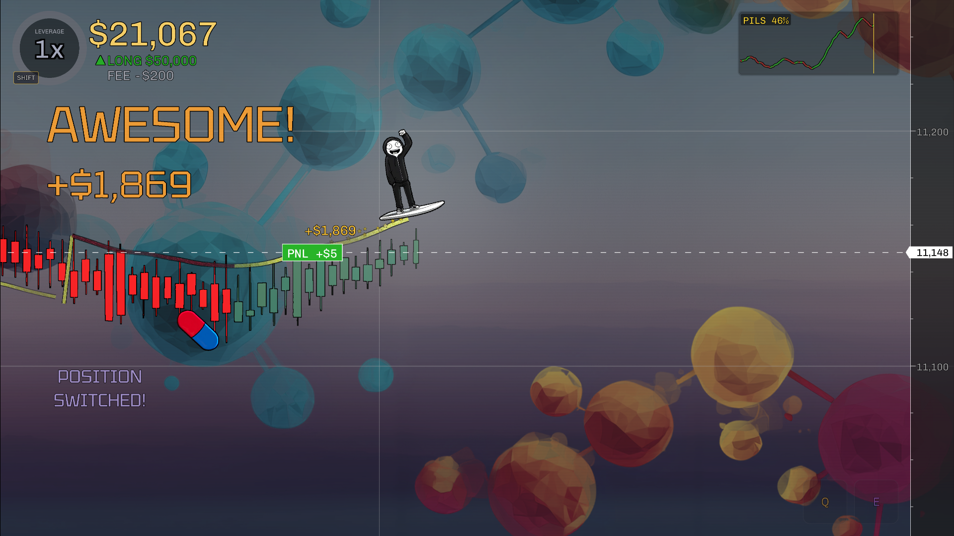 Every time you switch sides, you finish a trade and start a new one. String profitable trades for a streak bonus. Hold the leverage button to crank up your risk — bigger rewards, bigger losses, bigger fees. Hit zero and you get liquidated.