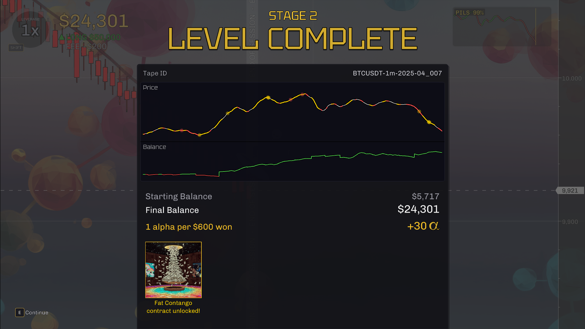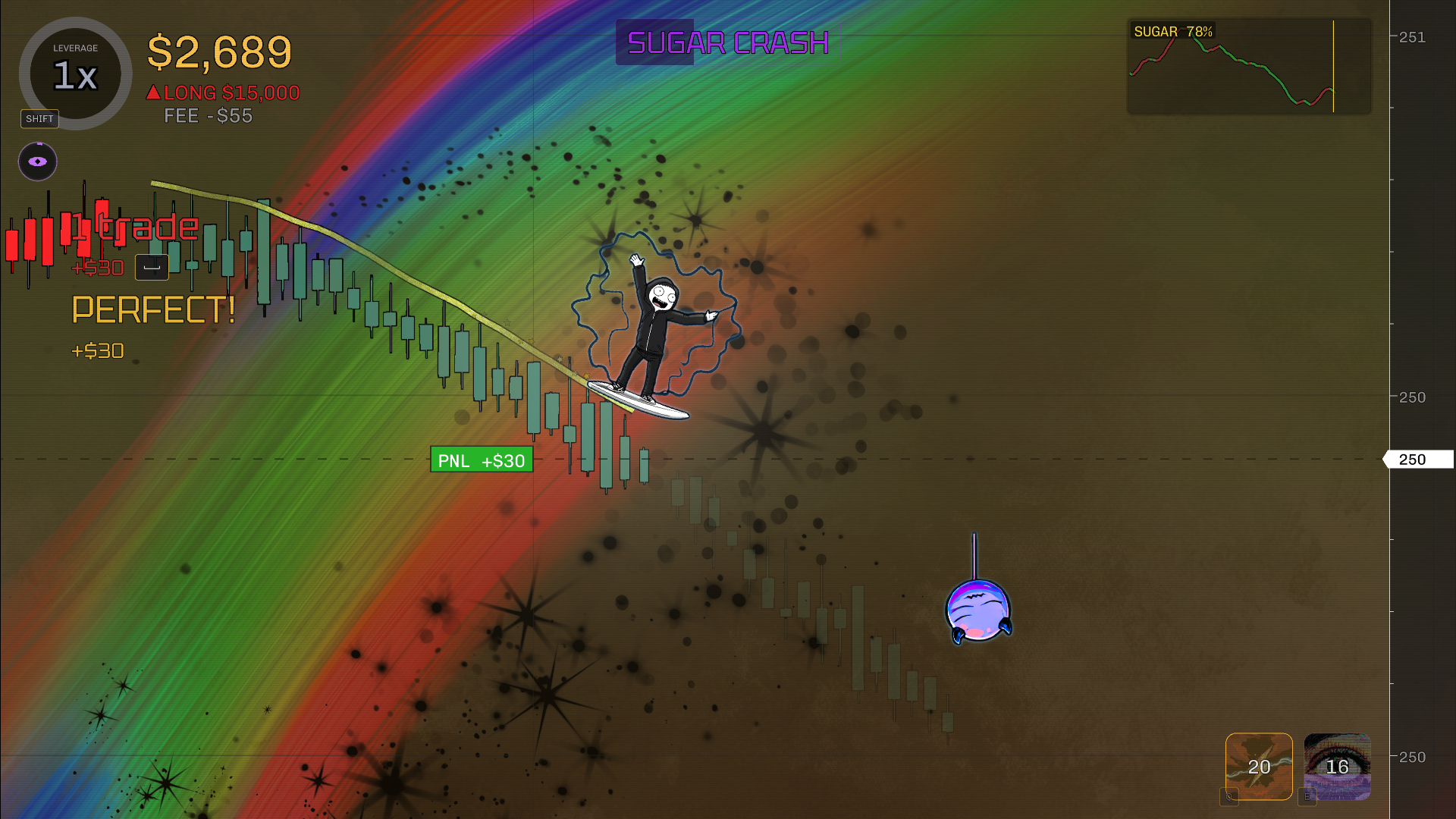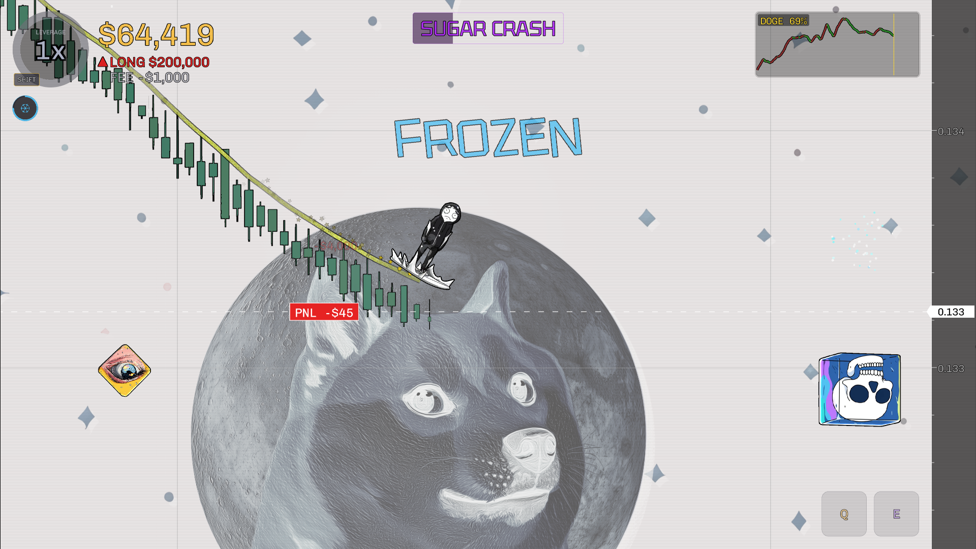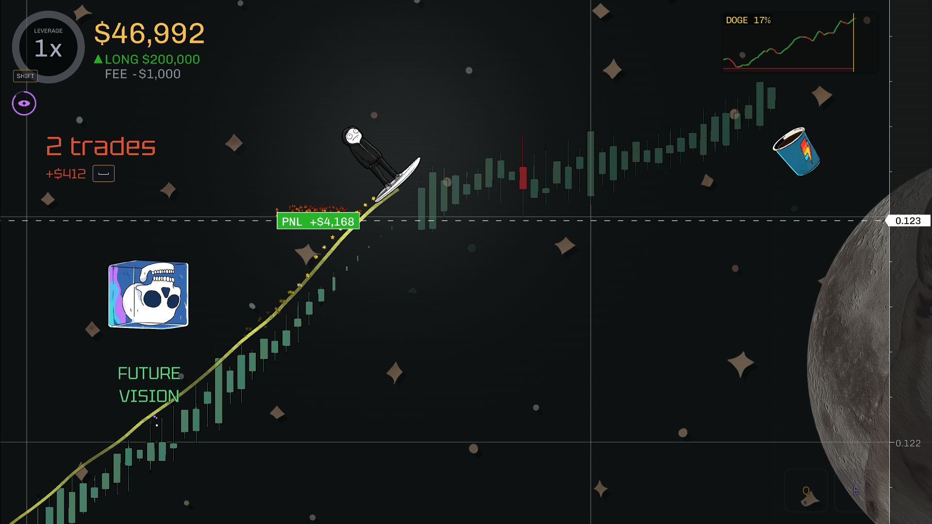 A price line scrolls across the screen. You're on it. Stay right-side up if you think prices will rise, or flip upside down to profit when the market falls. Your goal is simple: maximize profits to finish the run. No real money, no real risk — just pure trading fantasy.