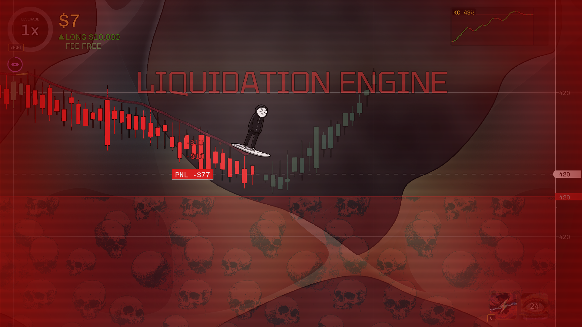 Hold a button to crank up your risk multiplier — bigger wins, bigger losses, bigger fees. Hit zero and you get liquidated.