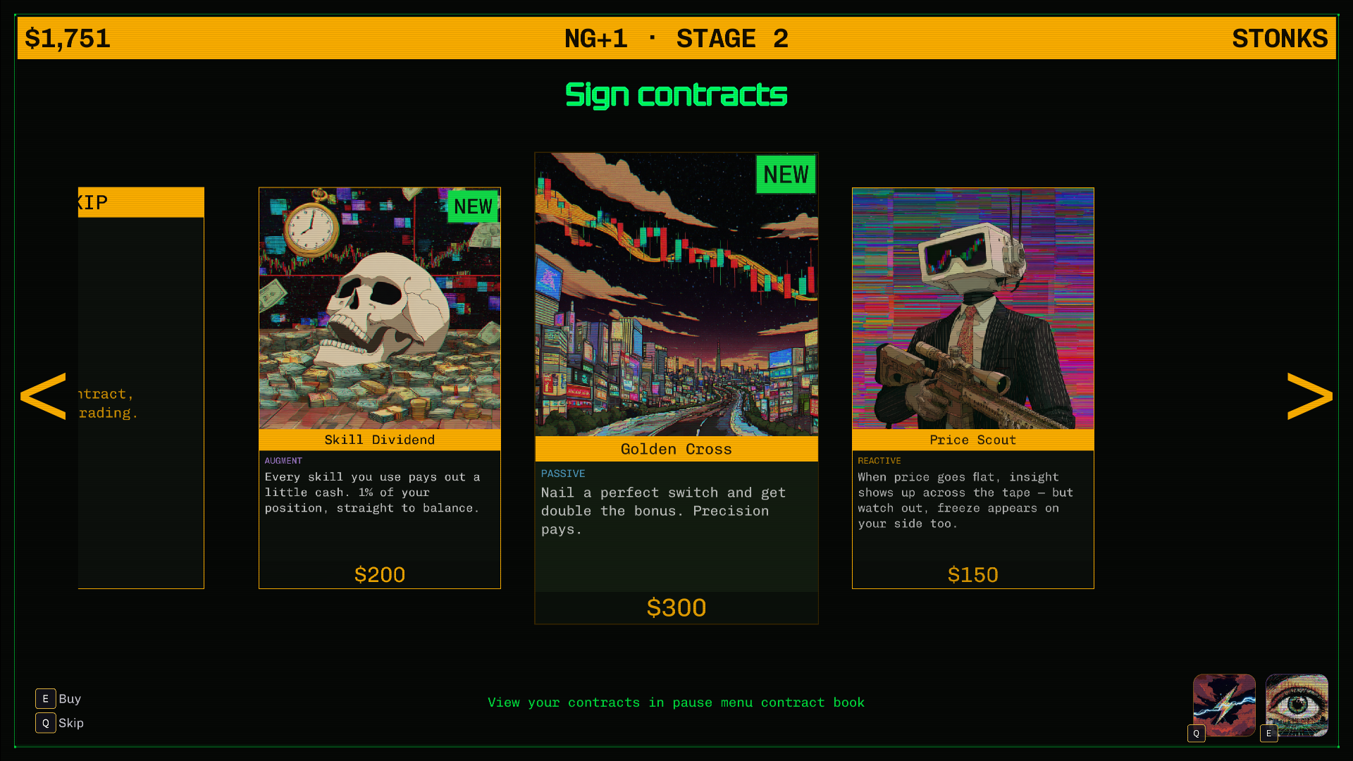 Pick contracts between stages: bigger bonuses, passive boosts, and one-time upgrades. Combine them for maximum profit.